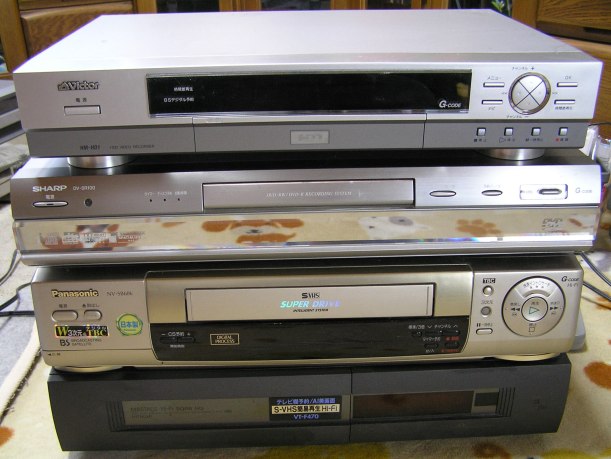 下から順に日立のVHS機、Panasonic製VHS機、SHARP製のDVD RECORDER、VictorのHDD RECORDERです!!