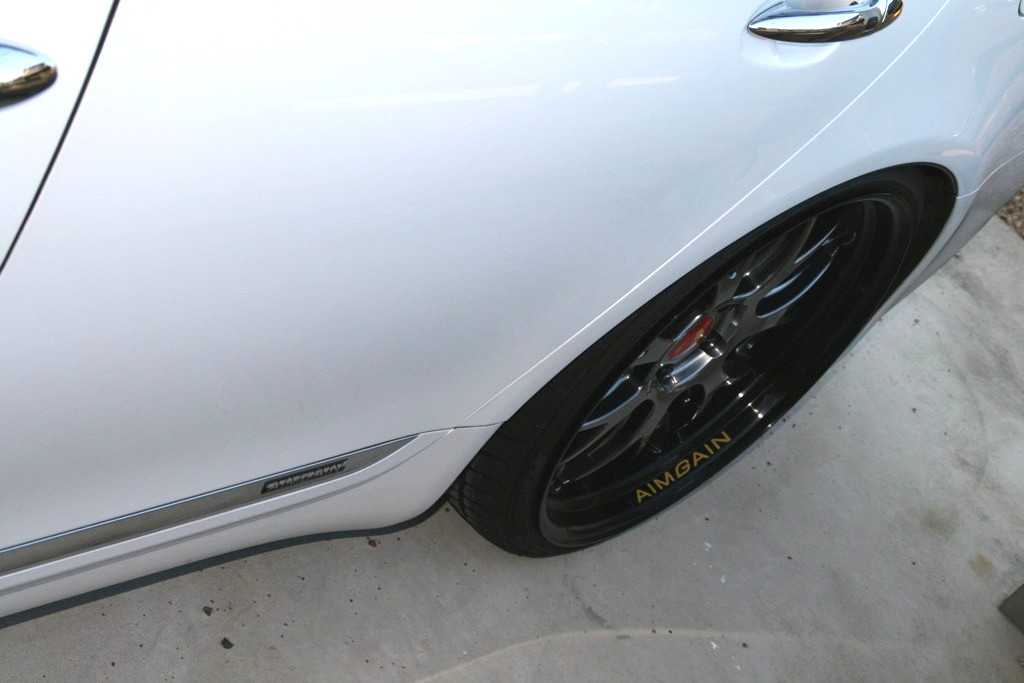 前後ホイールをセンターキャップ中心で対面に2か所貼り付けましたが、見るとやはり2か所では位置によりステッカーが見えません(デモカーは前後3か所)