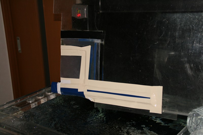これは2400水槽を設計した際に、ドライタワーを立てるのを前提にポリカ蓋を作ったので、ドライタワーを立ててない今は、蓋にぽっかり穴が空いてしまうので、プラ板で塞いでるんですが、やはり常に水が接触するのでどうしても剥がれて来てしまいます。