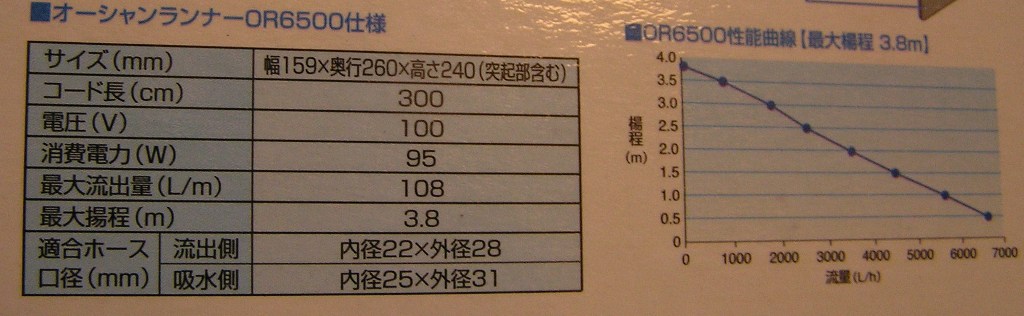 消費電力はカミハタが95wに対しレイシーRMD1001は365wですから電気代は約4/1で済みますが、最高揚程は倍以上差がありますので1m程の揚程ならマグネットポンプはほぼカタログ値通りの性能を発揮する様ですね♪