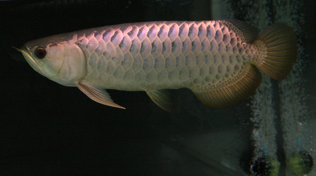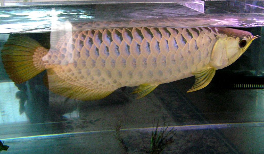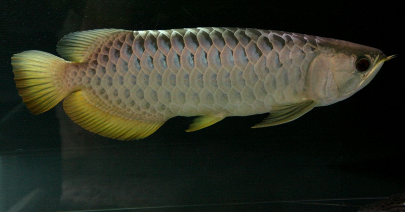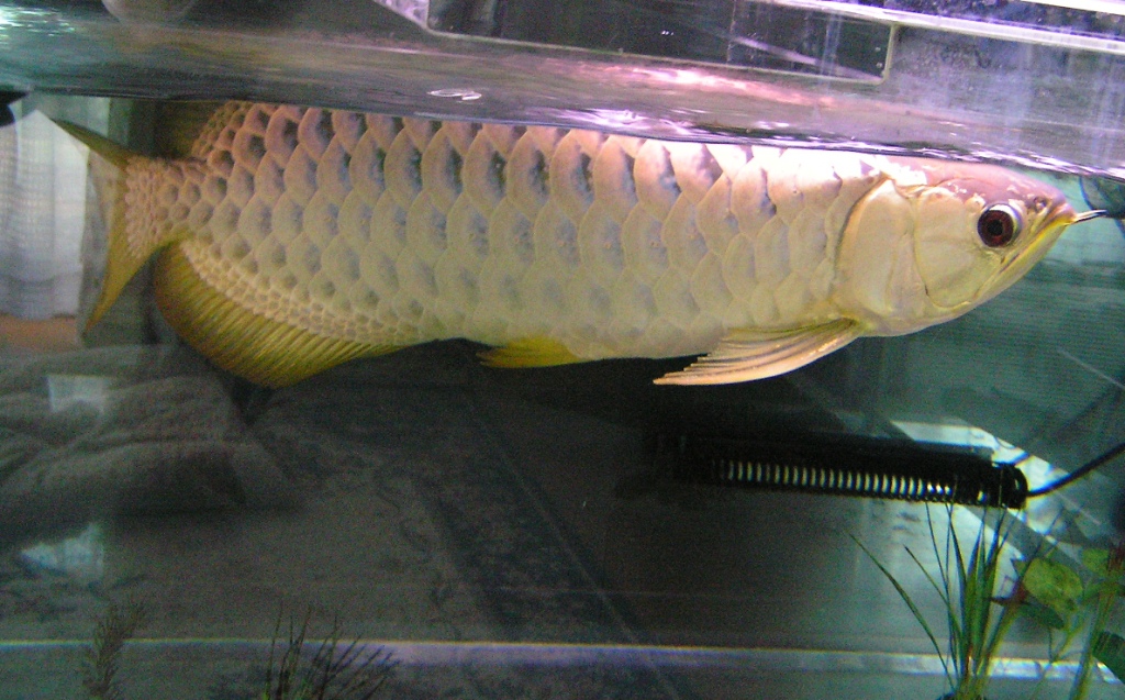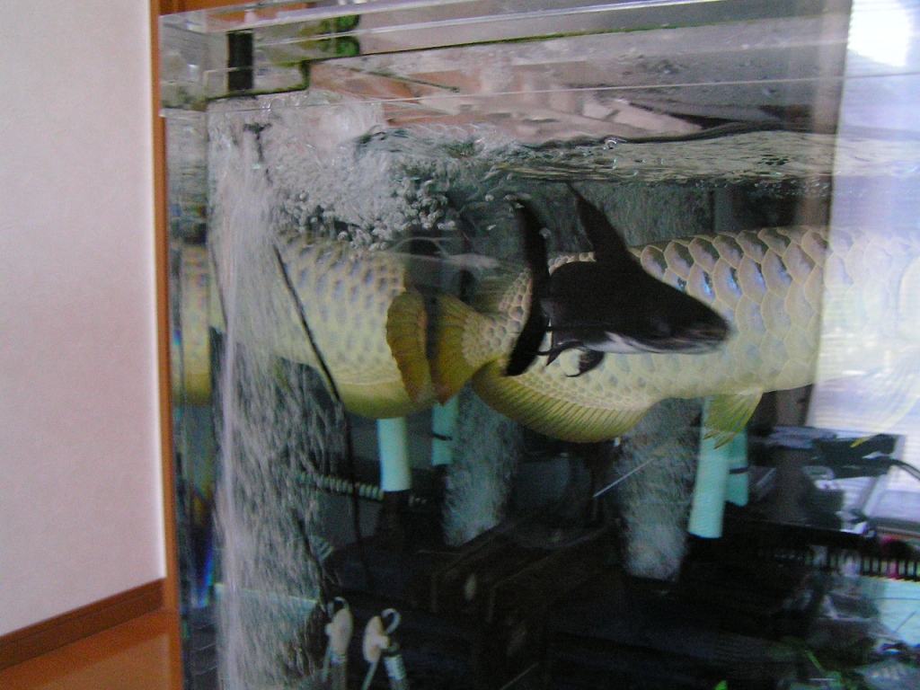 2400×900×600の大きなスペースにクリヤー水槽(背面のみ黒)に上部ライトなんで尾鰭に背後から照明が当たるとバンジャールの様に鰭が黄色く見えます。