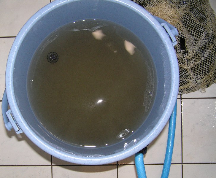 濾過槽内のヌメリを取る方法は、まづは排水部下にバケツを設置します。(浮力で固定されます)