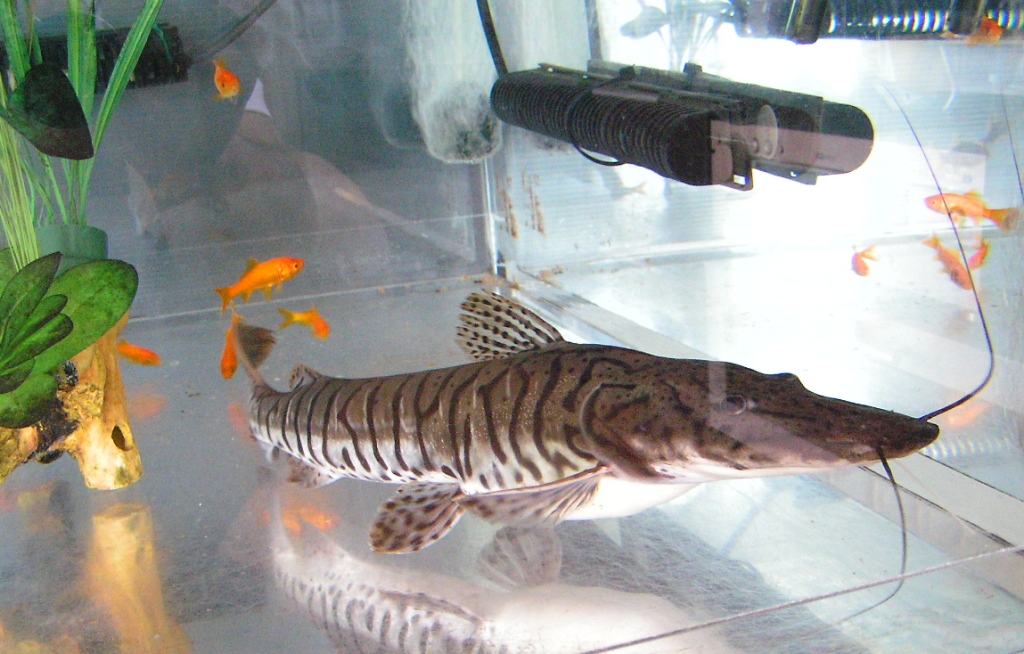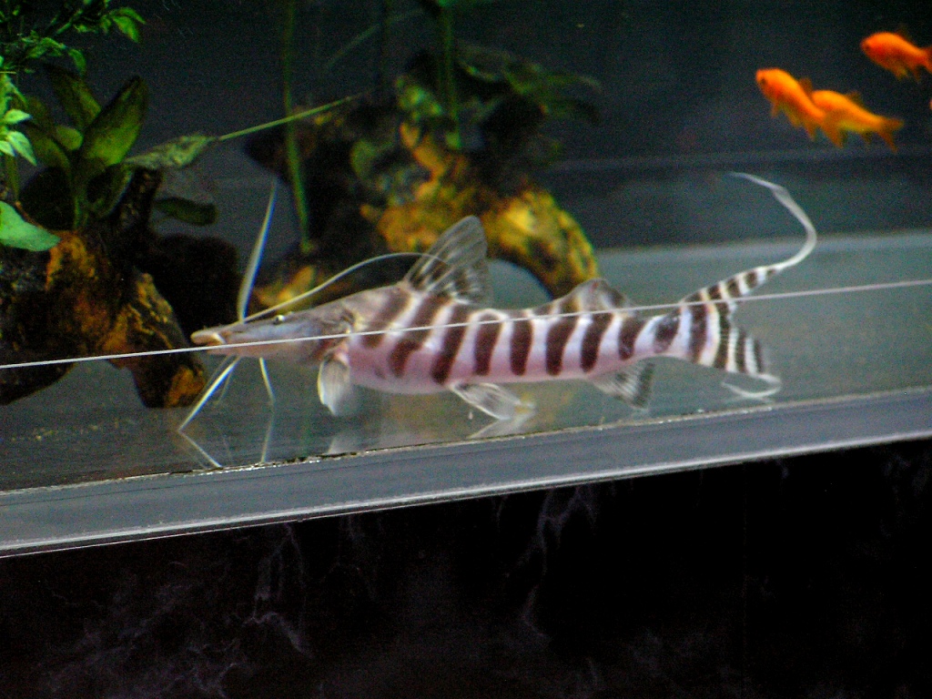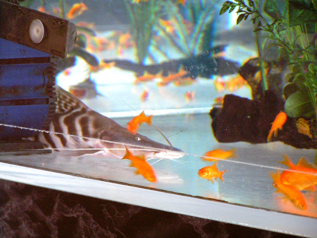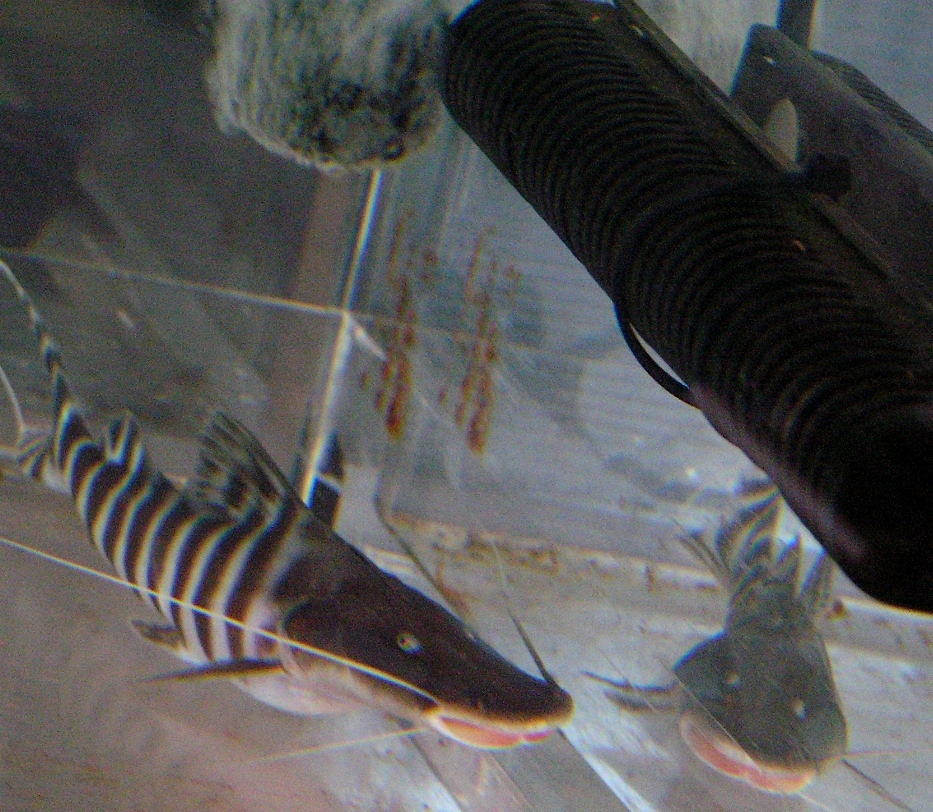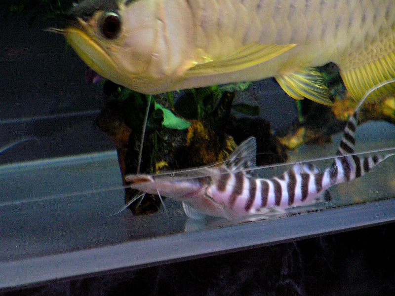 我が家の底棲ナマズでは一番小さなナマズ、ゼブラキャット小エルメスですが、頑張って姉金に喰いついてました♪