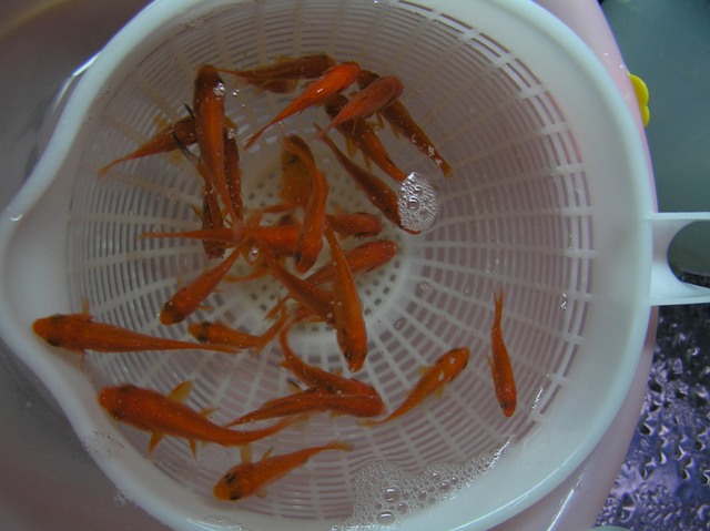水換えメンテに代わって日課となってるのが、ナマズ君たちの餌準備ですね(小赤の水温合わせ)
