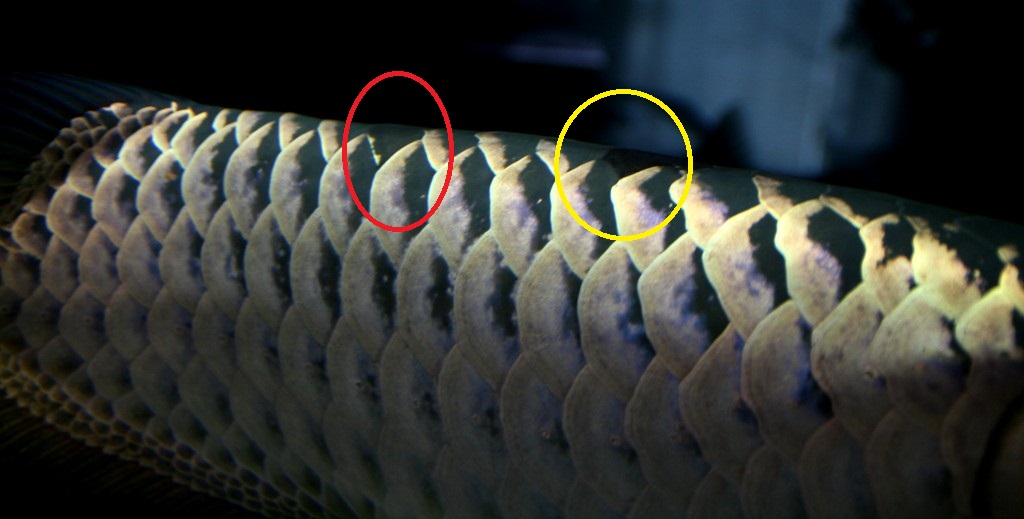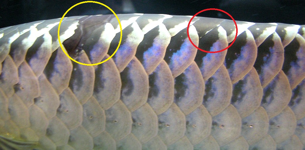 かなり前に飛ばした鱗(赤円内)が、ようやくここまで発色して着て、背中の鱗も綺麗に揃うゾと思った矢先に背中鱗3枚飛ばし(黄円内)....