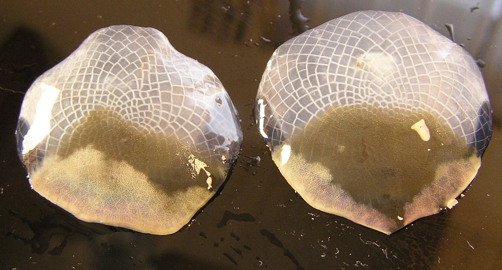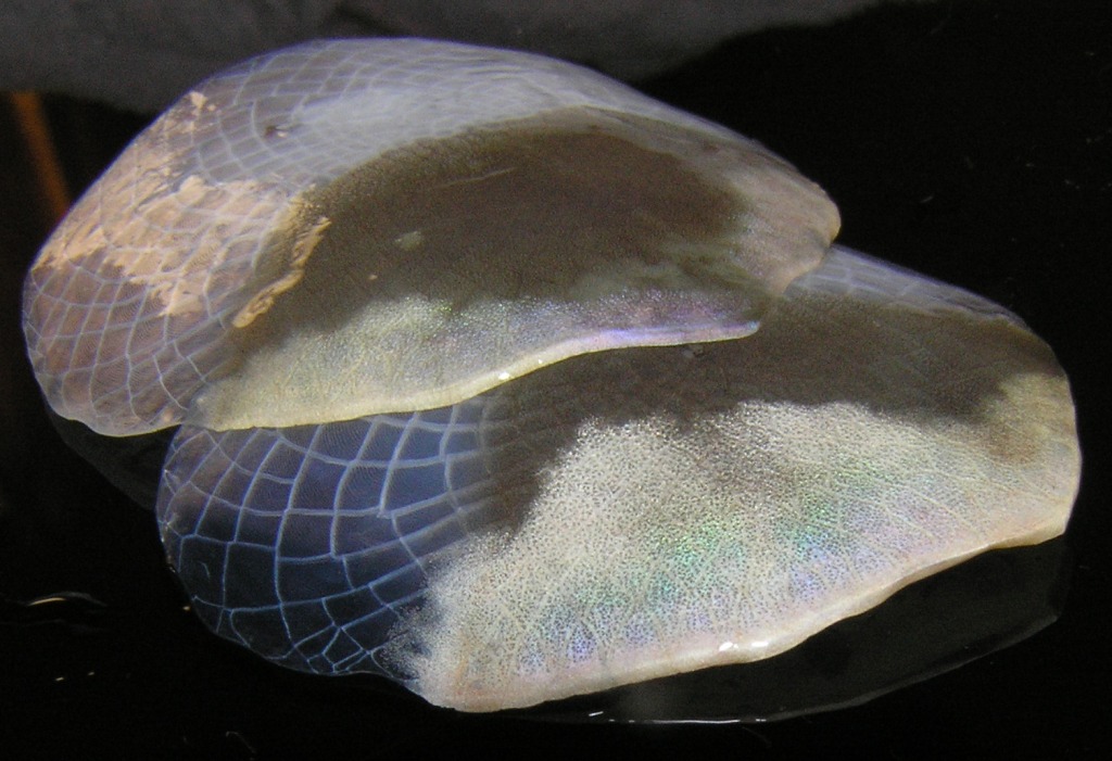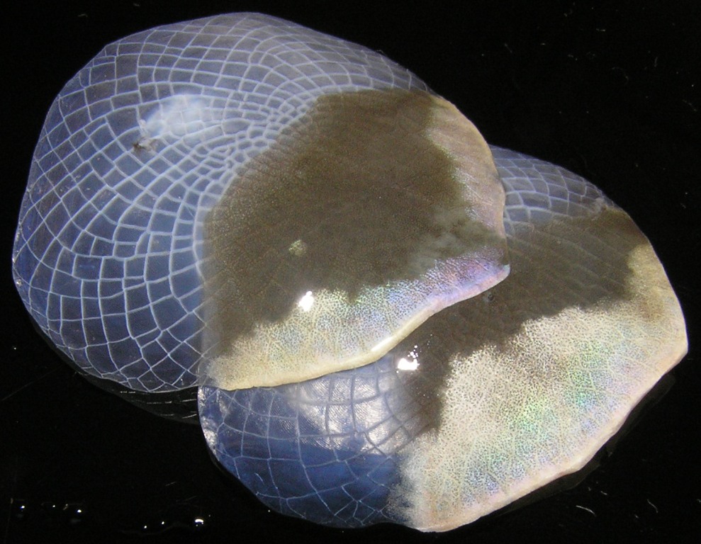 2枚の鱗を重ねると下の鱗の金発色が透けて見えます。