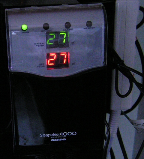 一旦26℃まで下がってしまうと温水で27℃まで復帰させてもすぐにはヒーター加熱が止まらないので27℃で温水注入(2400水槽はなかなか温度変化しないのだ)