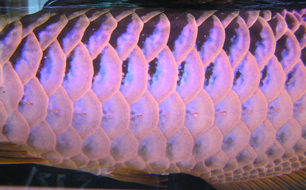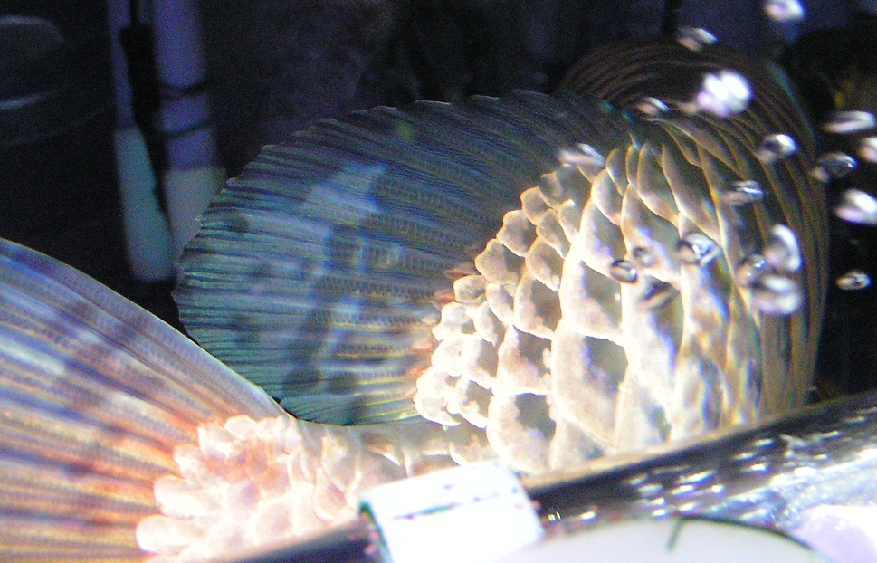 鱗の発色傾向ですが、第一鱗方向の外側から鱗底方向の内側への発色は当然ですが、鱗が重なり見えない部分(鱗の付け根部分)から鱗底へ(第一鱗框方向への外側方向)の発色もあります。