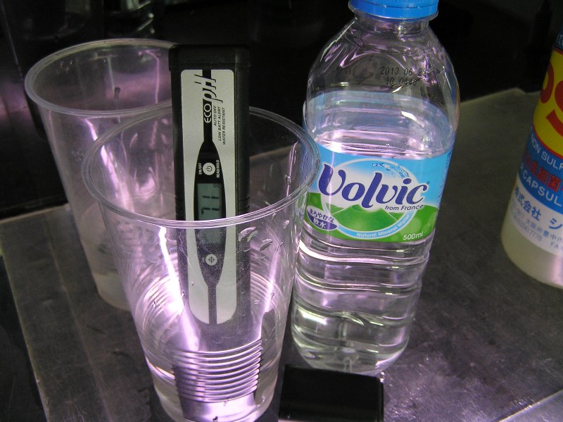 校正はPhメーター用の校正液は使わず、Ph7のVolvicを使用♪