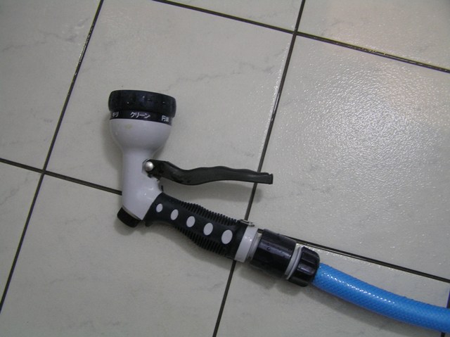 マット清掃は浴室でこの屋外用ホースリールのノズルで行ってます。