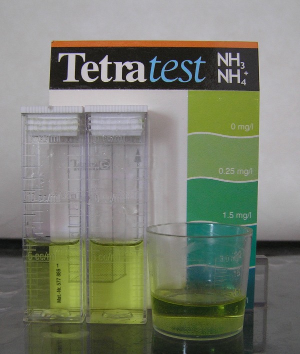 何か水道水が一番色が濃いですが、背景色の都合で3っとも同じ色で、アンモニアは0mg/ℓです。