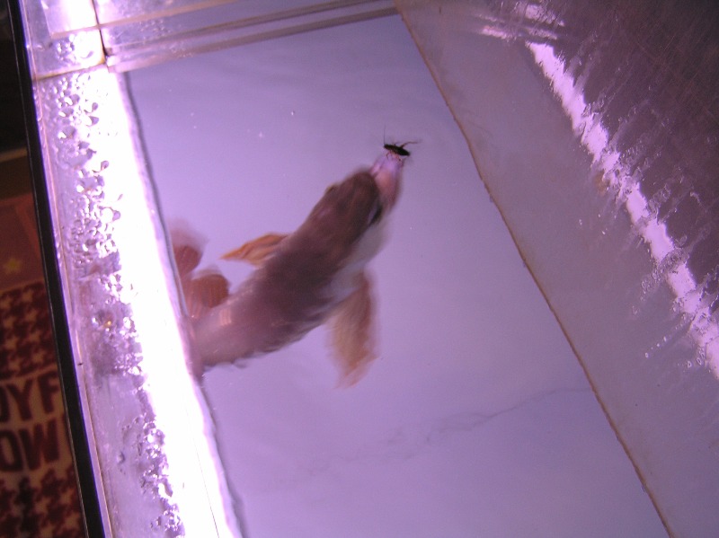 コオロギを与える時は脱走が嫌なんで、水槽蓋を開けて水面に投下したコオロギの同行を見ながら与えるので、コオロギはメンテ時に与える事にしてます。