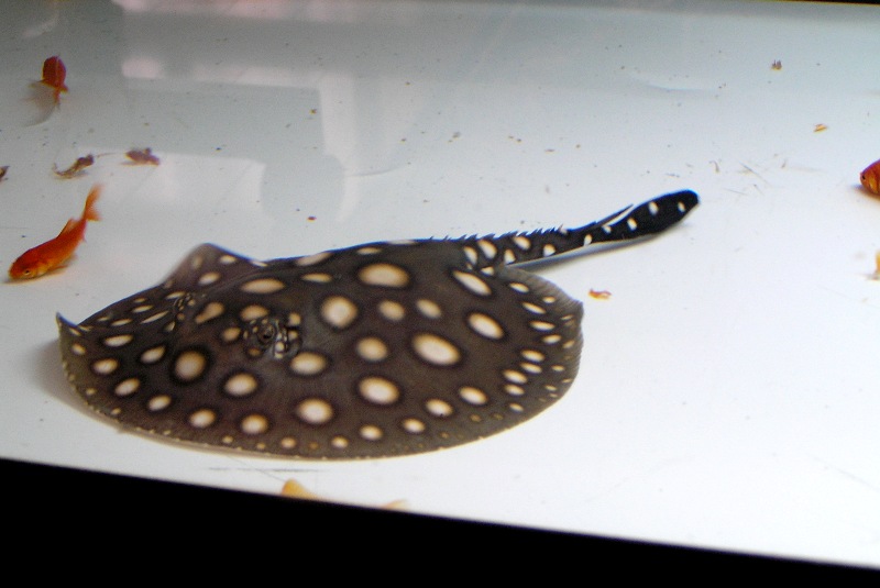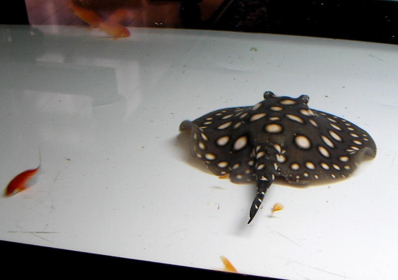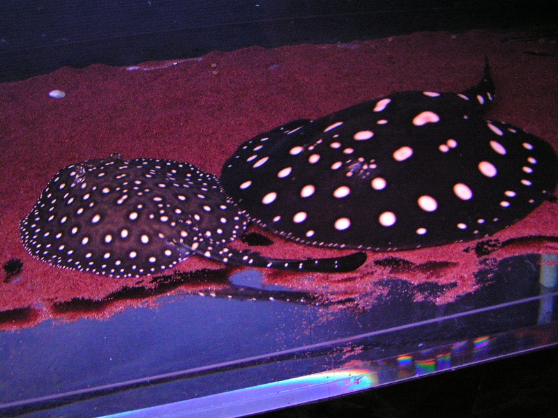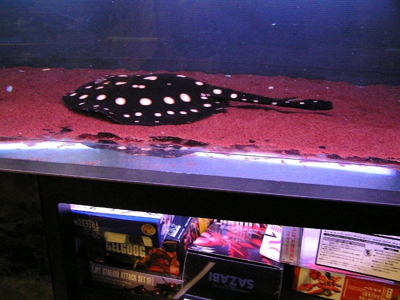 エイが昇壁して下りる際に、そのままドスンと垂直落下するので、その時に底砂のガーネットが押し遣られてクリアー底面からラック内に明かりが漏れてるだけなんですよね(笑)