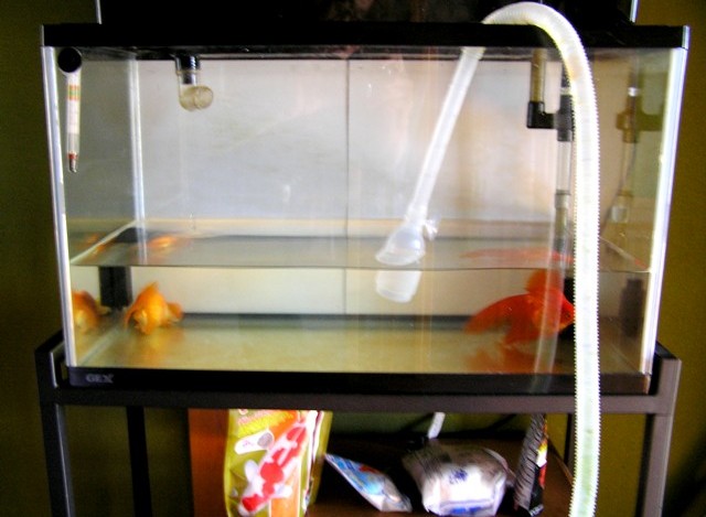 上部フィルターの水を抜き水槽に5/1から6/1残して排水して、あとはそのまま中の金魚ごと水槽を持ち上げ移動すればOK!