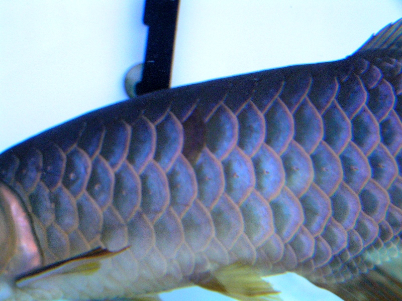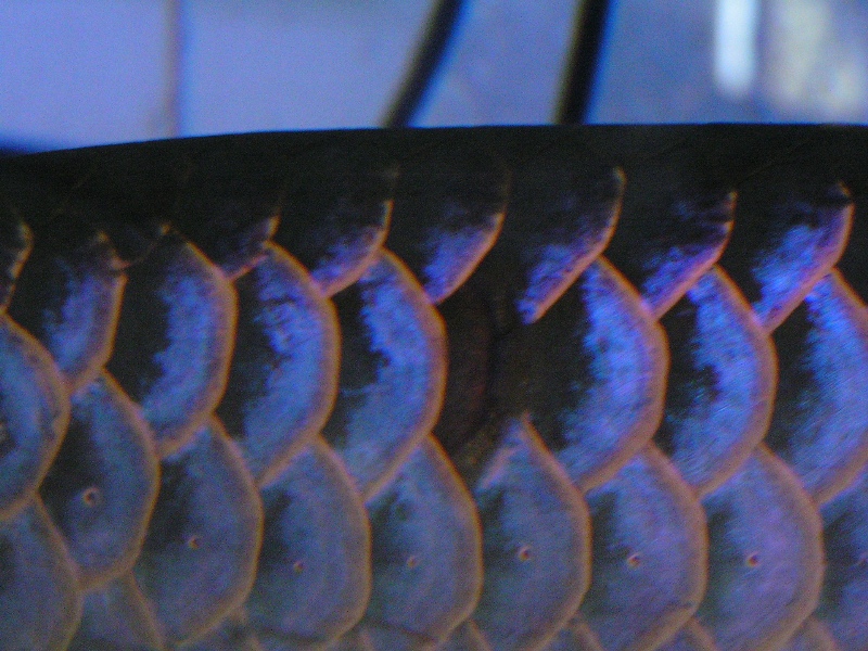 これらの事から考えますと、私がアジア アロワナ飼育を再開した2005年当時は藍底過背金龍が青いのは藍底個体の肉が青くそれが鱗から透けて見えるといった説を説く店もありましたg、藍底過背金龍の鱗は抜けても鱗自体が光を受けて青く輝くのでその説は違うと思うと書いた所。いつの間にか「藍底個体は肉が透けて見えて青く見える」説は聞かれなくなりました。