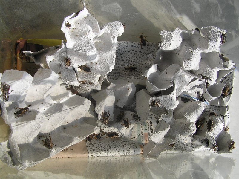 格安コオロギは500匹という事もあるのか、コロコロの糞が大量に新聞紙に付着してますが、今回のスーパーブラックコオロギは糞はほとんど有りませんでした。