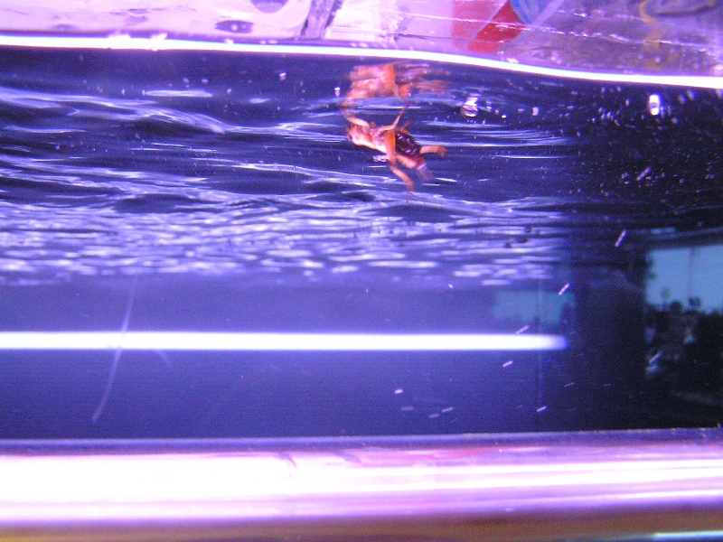 その結果、前回も書きましたが、水槽に投入すると普通のコオロギは水面に浮きますが、スーパーブラックコオロギは水中に潜って泳ぐコオロギが沢山居ます。