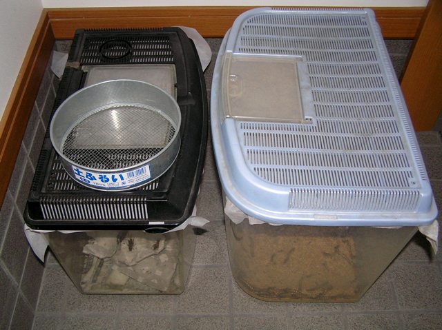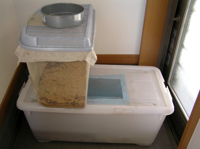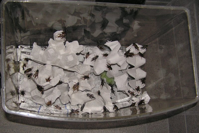 ワームは昆虫飼育ケースでキープしてるんですが、コオロギはこれまで大量注文だったために衣装ケースでストックしてましたが、コオロギの品不足で200匹の注文だった為に、大きなケースでは、場所も取るし餌やり時に取り出しにくいという事で、昆虫飼育ケースでキープに変更しました。