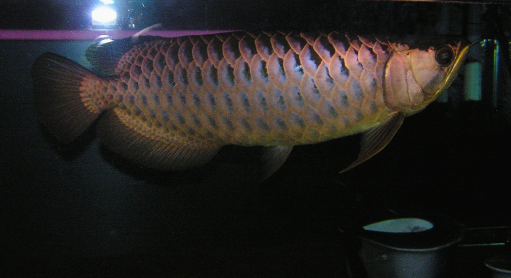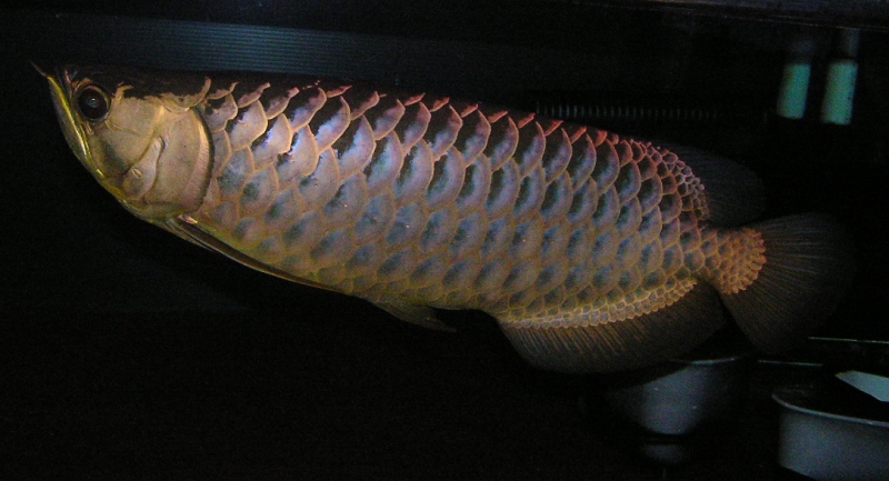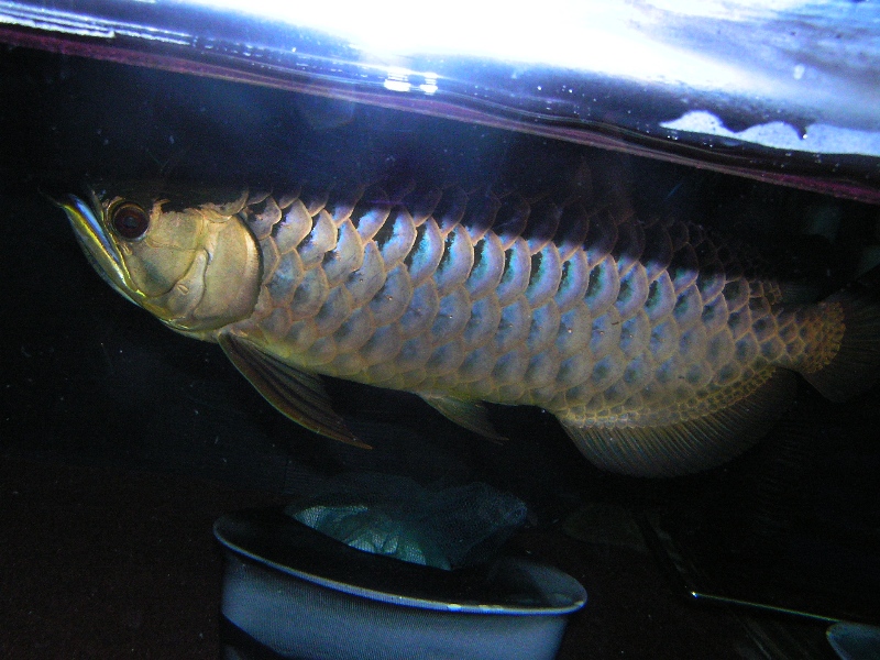 帰り道にも前を通ったんですが、夜はライトがついてまして、遠目には紅龍にみえました(多分、ライトはフィッシュルクスかな?上がりは背鰭の前から4枚程度で上がりはイマイチでしたが、鱗の鱗底には青味が残っており藍底個体と思われます。