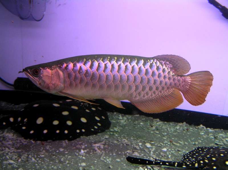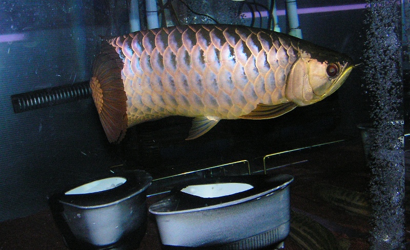 アジア アロワナでは次号?のアロワナ特集のFM誌に掲載されるという藍底過背金龍がいましたが、確かに青いのですが、水中蛍光灯の上に小さな青い水中ライトがあり(殺菌灯?使った事がないのでよくわからんけど....)、あきらかにその青い光を受けての青さでしたし、光の届かない低層でみるとそれほどでもない気が.....