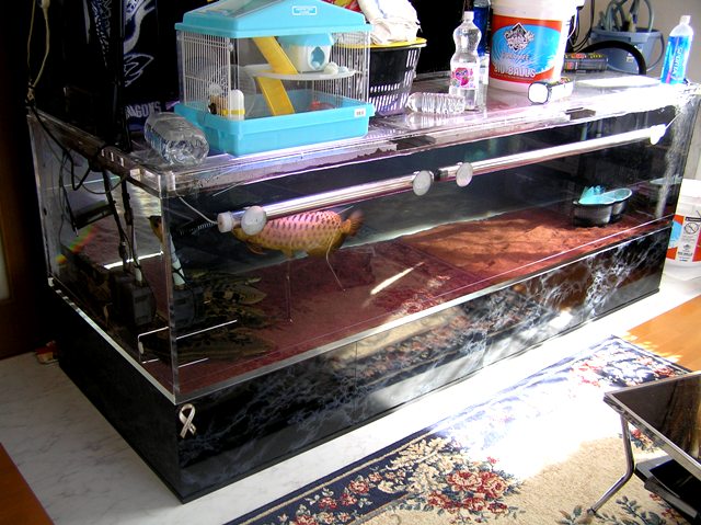 設置場所は、寒くなり玄関先では厳しいので、冬場必殺の水槽の上。