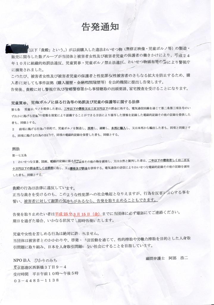 内容は無修正&児童ポルノDVDなんかを製造してた業者が摘発されて、なんか知らんが被害者(女性や児童?)が告発しますよという内容 くぱぁ。