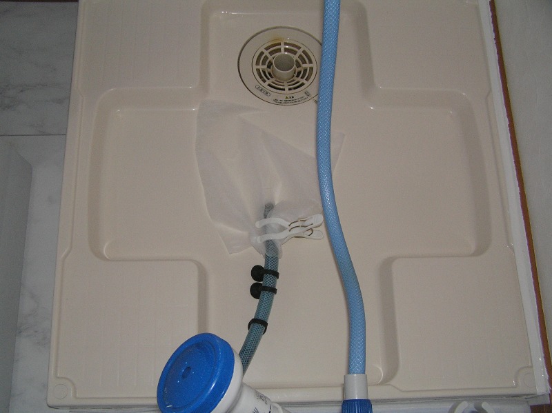 飼育水の排水は、そのまま排水口にホースを突っ込まずに台所用の排水口に付ける不識布ネットをホースに付けて排水しております。