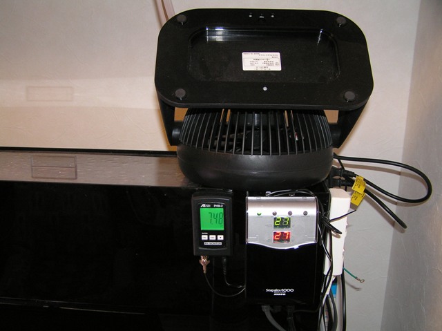 ポンプの開口部からサーキュレーターで強制的に風を送り気化熱の作用で水温上昇を抑えようという魂胆ですが、今年は最高でも31℃で平均30℃で抑えられてました。