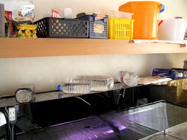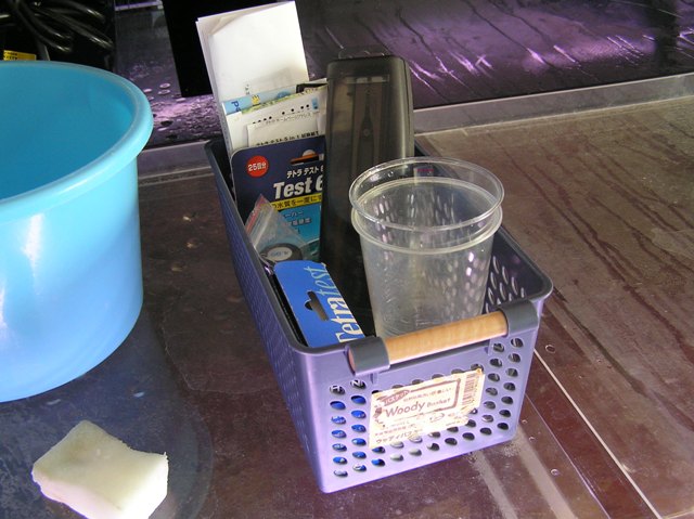 ペン型メーターや試験紙を一まとめにして水槽の上の棚にポン!!