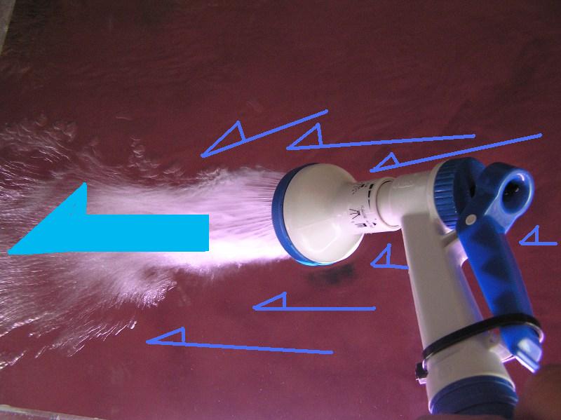 一番自然なのは右側が一番強く排水は左へ流れるのがイイんですが、左にぶつかって水の澱みができる恐れがあるので、中央部が一番強く右側の水を引っ張る形で左へ排水される様にしてます。