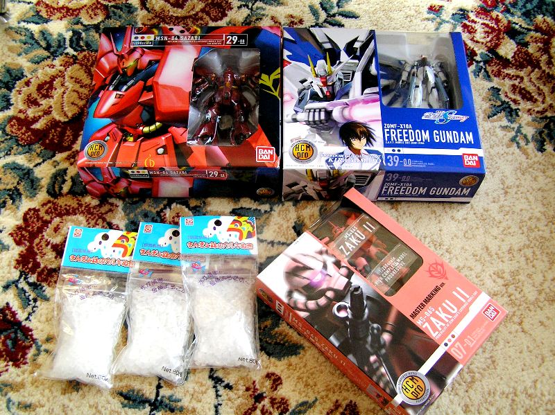 シャア専用ザクとフリーダムガンダムと、今PS3のガンダム無双2で戦ってるシャア専用機サザビー?の1/200フィギア♪
