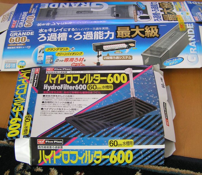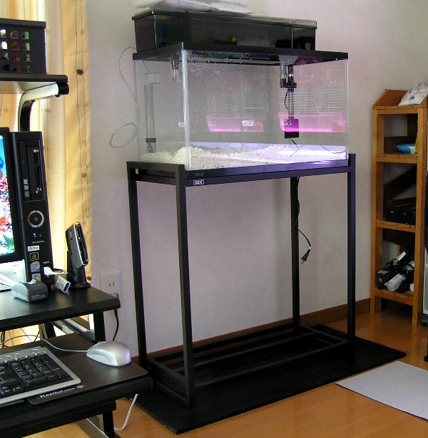 水槽はこれまでの600水槽を利用しようと思ったんですがシリコン部分が劣化して残ったガーネットが付着してたので、せっかくの水槽部屋という事でGEXの600水槽と水槽台を新規で揃えました♪