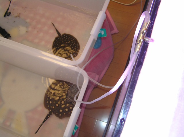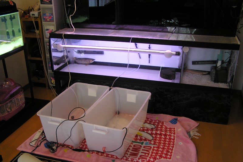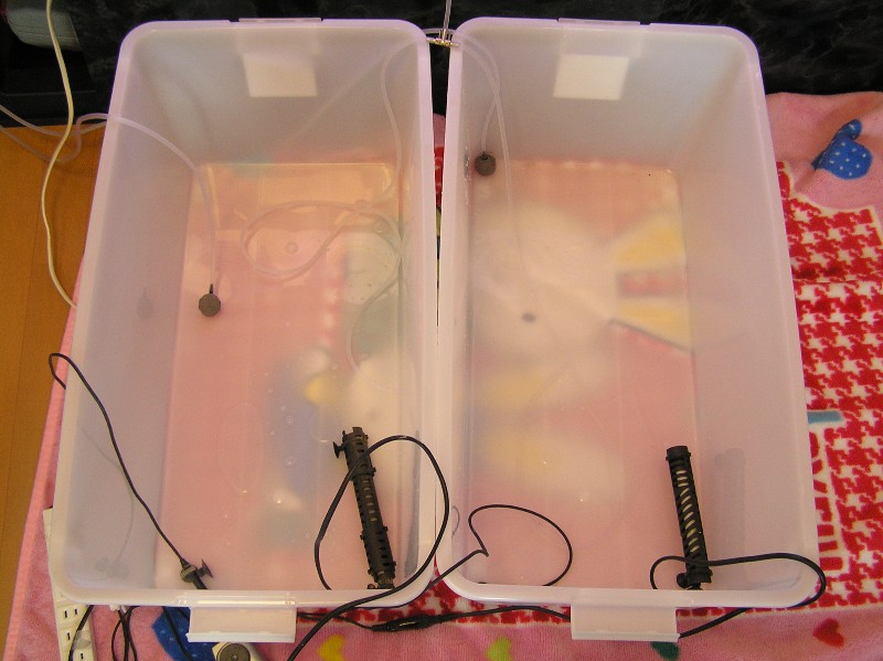 2つの衣装ケースにエアホースを分岐コックで2分して、1800水槽の飼育水素ポタポタと点滴で垂らし