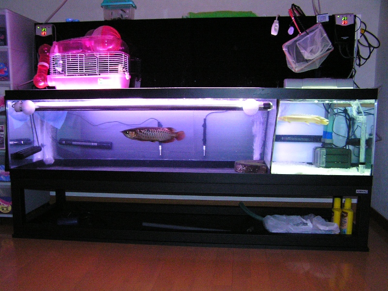 1800水槽の収容メンバーは向って左の黒エリアに新入り藍底過背金龍、右の白エリアにアルビノセネガルスと白変ラプラディを収容♪