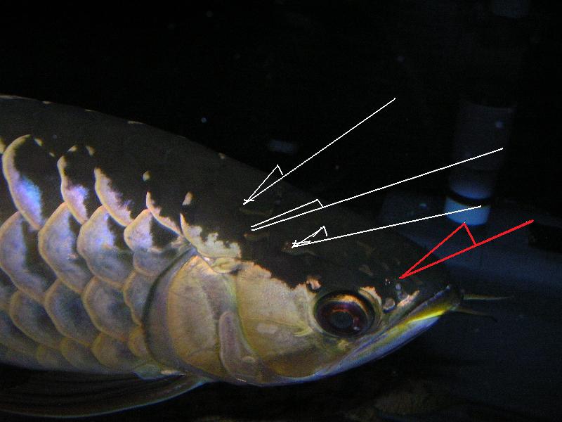 白い矢印が第一鱗カクと呼ばれる部分でこの部分の細いのを細カクと呼び逆に太い物を粗カクと呼びますが、大抵の藍底個体はこの部分は細いです(笑)