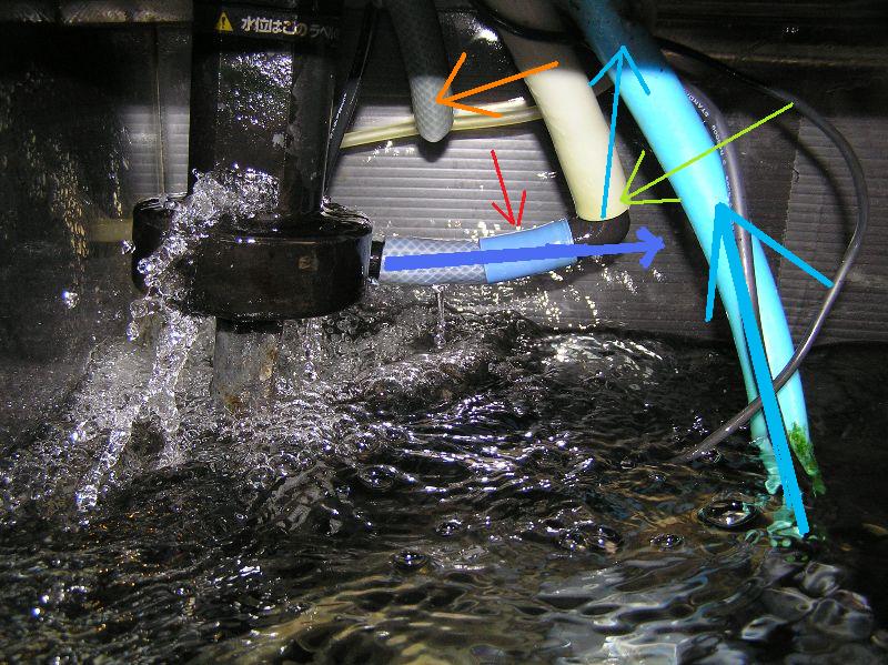 外れてたのは赤の矢印のホースですので、青の太矢印方向に水が逃げてて、ドライタワーへは水中ポンプからの太水色矢印のみで汲み上げてる状態でした。