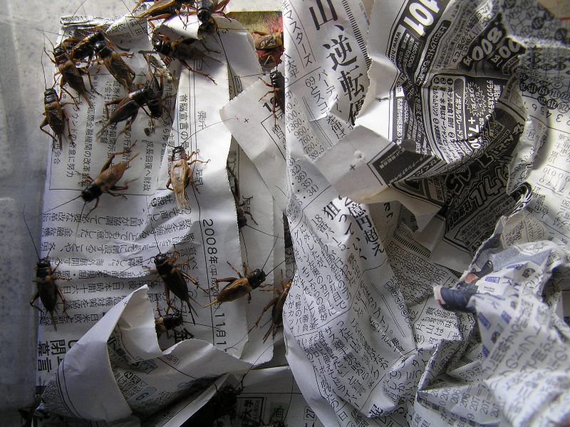 常食用のプラケのコオロギが居なくなったので、新聞紙を敷き直し、大量ストック用の衣装ケースからコオロギを移動♪