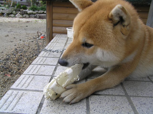 いつもは離れた場所に咥えて行ってガシガシやるのですが、今日は雨で地面が濡れてるので濡れて無いこの場所でガシガシやってます(よく知ってるわ~(笑)