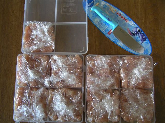 土曜のメンテ終了後に鳥ささ身肉をカットして小分けしてると、娘が子供用包丁でお手伝いしてくれて助かりました。