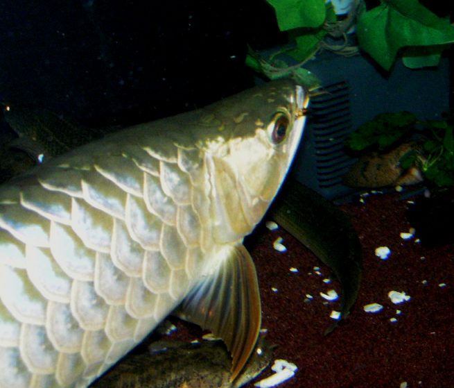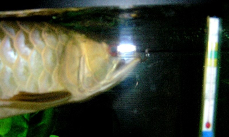 顔は水槽前面に近い為にストロボ光が強く綺麗な金色に、身体後半は前面からやや離れてるためにフィッシュルクスの色あいが反映されちゃった結果ですね。