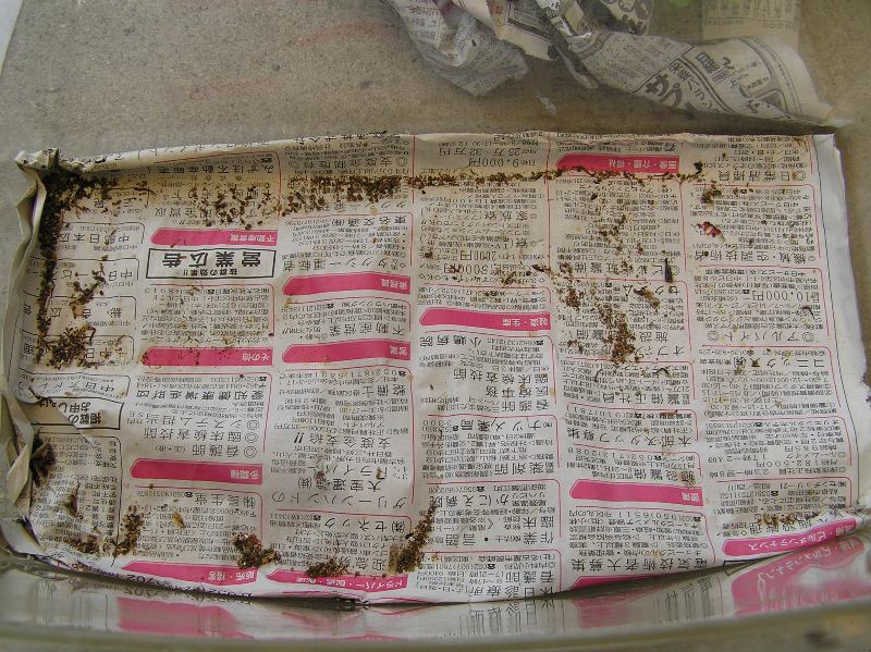 餌が足らなかったのか?新聞紙を結構食べた跡がありますね。