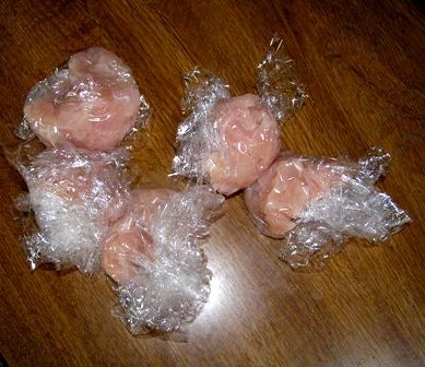 一口サイズにカットしたささみを、一回分づつに小分けしてラップに包みます♪
