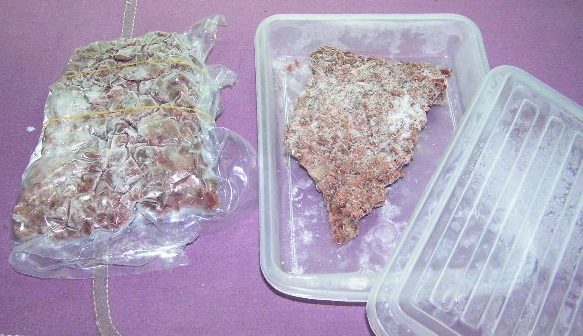 しかし、今回は宅配業者の手違いで一日前に取りに来る物と勘違いしてしばらく常温で置いてあったみたいで一度解けた形跡があるので、真空パックでも水分で氷が付着してます。
