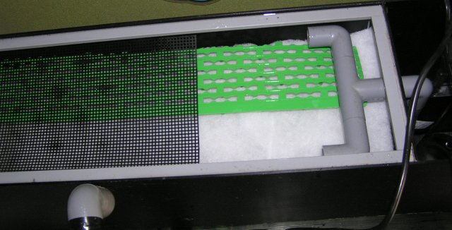 水槽から汲み上げた水は左のパイプと中央のパイプからマットに落ちるので2種類のスノコで均等にドライボール層に水が落ちるように工夫してます♪