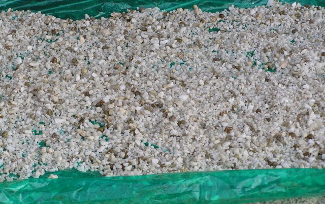 天日干しは1日~2日干して、砂利の表裏を返すのにかき混ぜて、さらに1日~2日干せば小さい砂利は完全に白くなります、大き目の砂利は薄緑な感じになります♪
