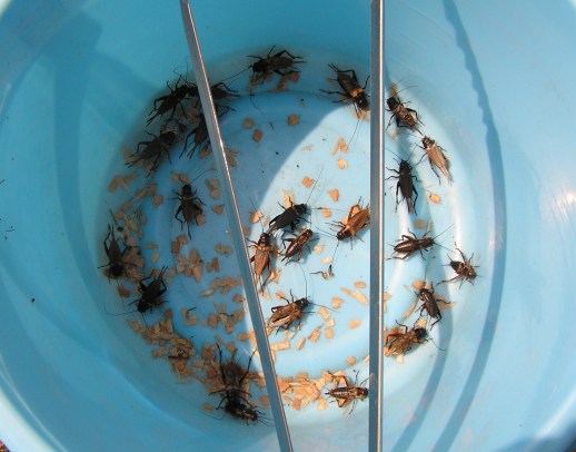 コオロギも入れるとすぐに集まってきて、餌を食べてます♪