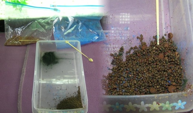 アスタキサンチンと魚粉の混合物、フィコシアニン原末青色の粉末)、スピルリナ原末(緑色の粉末)を、アカールに秘密の液体で湿らせ、それを粉末の接着剤変わりにして振り掛けます。