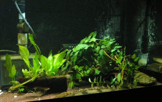 水槽左の流木はかなりシダ植物を増やしたので流木下のトンネルはかなり暗くなりました。