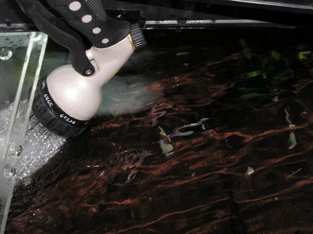 水換えは水槽用の吸水ポンプで吸い込み排水口(台所の排水口の水切りネットで大きなゴミやガーネットはキャッチ!キャッチ!!)に流し、注水は風呂場からホースリールで温水を引き込み温度を合わせて注入♪