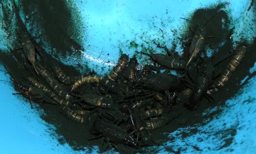 そのスピルリナの原末をワーム、コオロギ&ザリガニ等にふりかけ、直接アロワナに経口投与します。